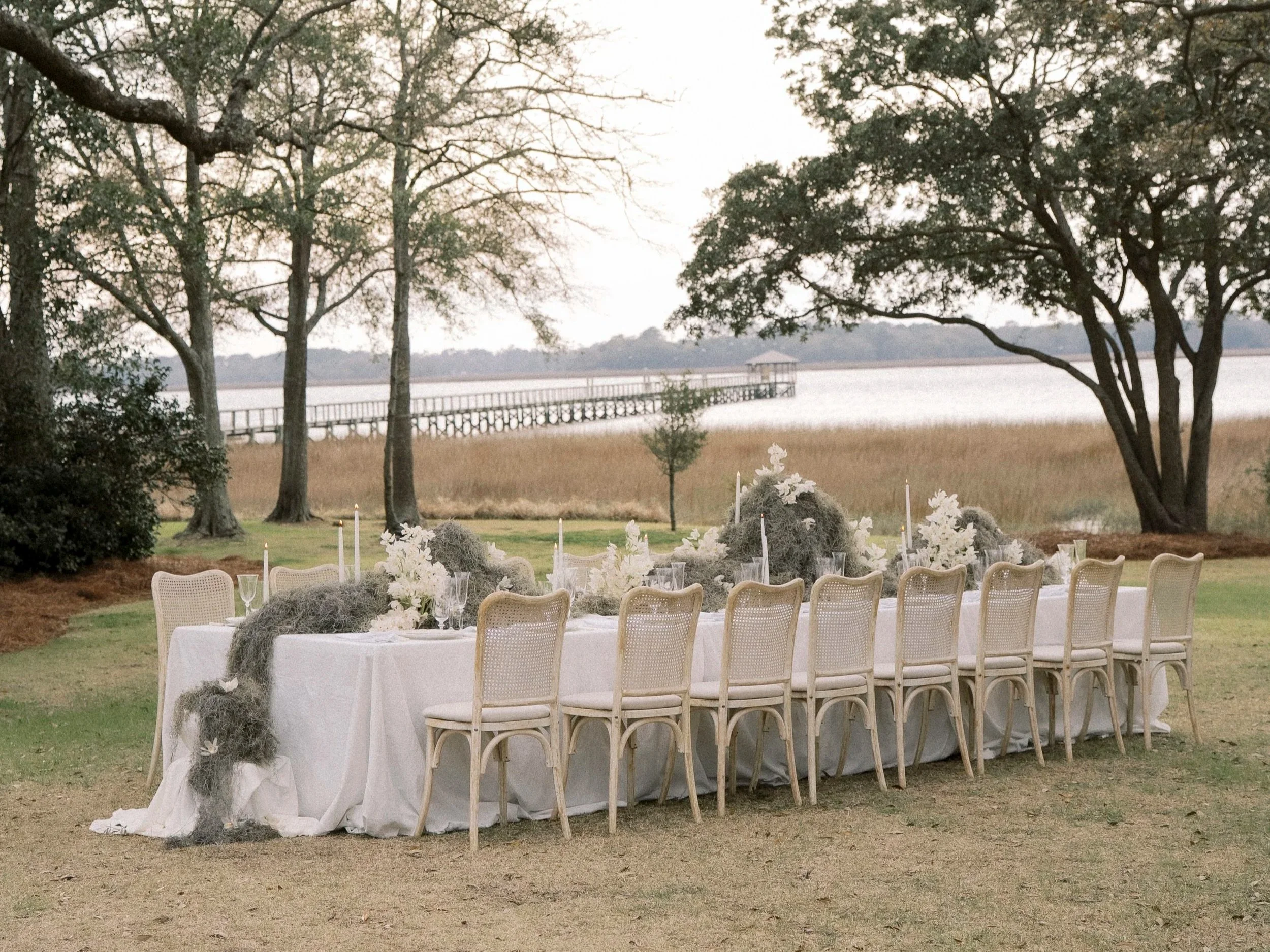 Long dining table set for a formal event with floral centerpieces, candles, glasses of champagne, and place settings including napkins, plates, and cutlery, surrounded by white chairs.