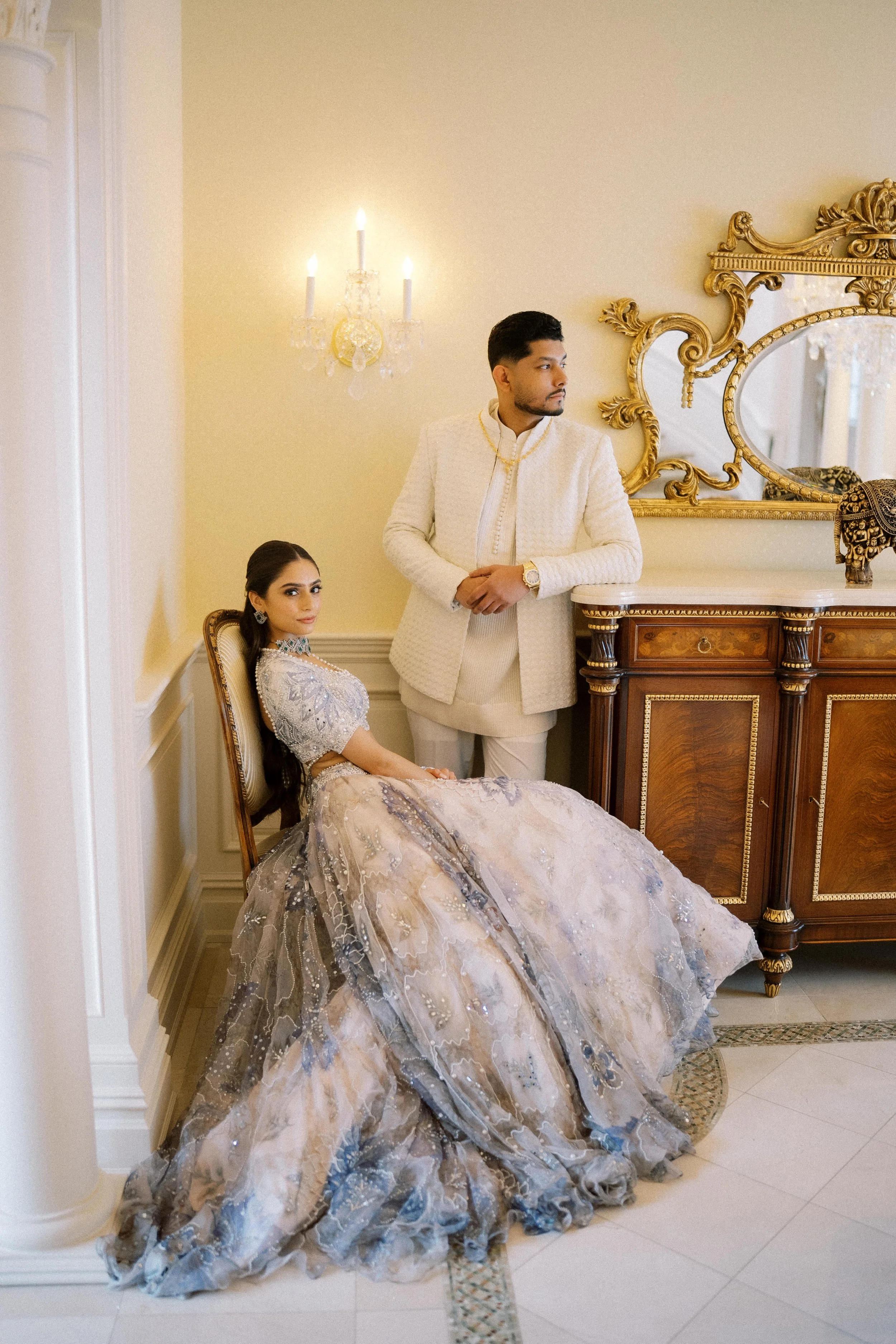 Hosted in New Jersey, this luxury Indian engagement celebration was a masterclass in intentionality. Every detail, from the ethereal gown by Mahima Mahajan to the groom’s refined attire by Sawan Gandhi reflected their unique style while honoring tradition. Meesha had a very specific vision for their photos and she came to me with lots of ideas. They allotted the perfect amount of time to capture a beautiful variety of images that helped me to tap into my artistry on both 35mm film and digital mediums.